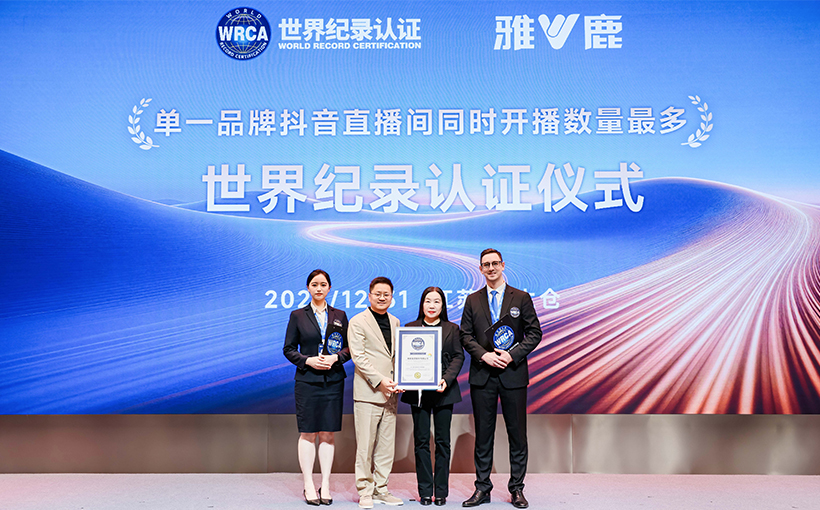 由雅鹿集团股份有限公司发起的世界纪录认证官方挑战,于2025年12月31日19时50分至20时50分,共组织雅鹿品牌旗下共411个有效直播间同时在抖音平台进行直播。经世界纪录认证(WRCA)官方审核,该活动成功创造“单一品牌抖音直播间同时开播数量最多”世界纪录。纪录编号:WRC251129A