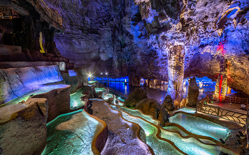 滴石铸玄女,暗河镂九天。2018年,张家界茅岩河景区九天玄女洞对洞内灯光实施全面改造,用不同色彩的灯光,展示从玄鸟到玄女的上古神话故事,玄女帮助黄帝打败蚩尤的历史故事,引出华夏文明的内容。通过“土家新娘、土家山寨”等节点,演绎华夏历史,到具体族群繁衍生息的场景。洞内灯光秀,将神秘幽暗的地下世界,展现成多姿多彩的历史和生活场景,如梦似幻。