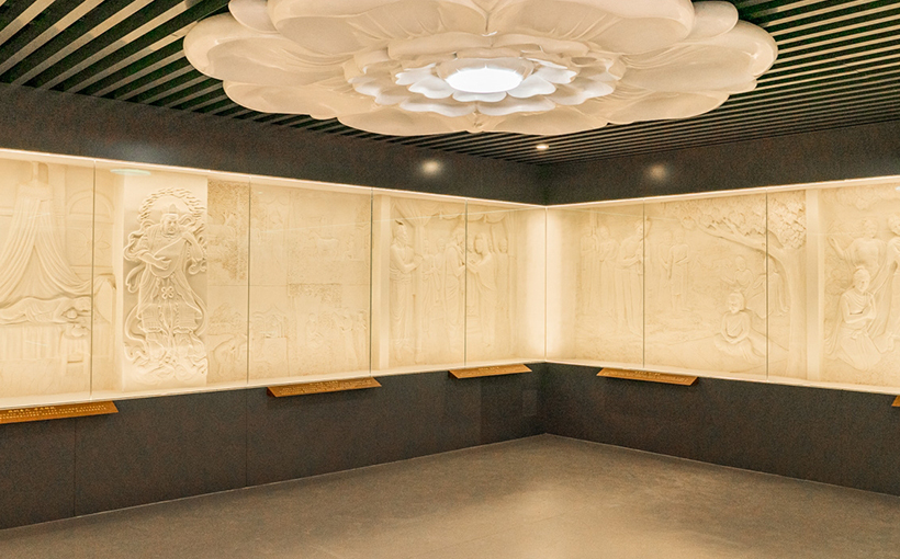 A ceramic relief wall, located on the second floor of the white marble stupa in Panlong Temple Scenic Area, North End of Heli Street, Funing County, Jiangsu, China, was designed by the monk Yanli, the abbot of this Buddhist temple, funded by Chang Hao from Nanjing, and created by Chen Jianping, a ceramic craft master from Dehua. Carved in Dehua porcelain wall pieces and seamlessly spliced together, the relief measures 291 m2 (181.9 m long × 1.6 m tall). Verified by the WRCA, it has been confirmed as the "Largest ceramic relief depicting the Legend of Buddha".
